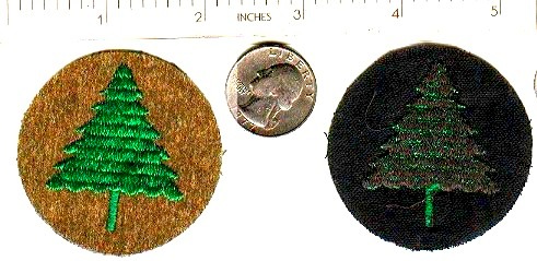 These small (2 inch) patches were made by The Studley Co. strictly for Veterans. The discharged soldier was required to provide proof of service in that unit before the sale of the patch(s) was approved. They were worn on the the left side of the overseas cap and were a favorite of the members of the VFW and the American Legion. They are machine embroidered onto olive drab wool with a black gauze backing.