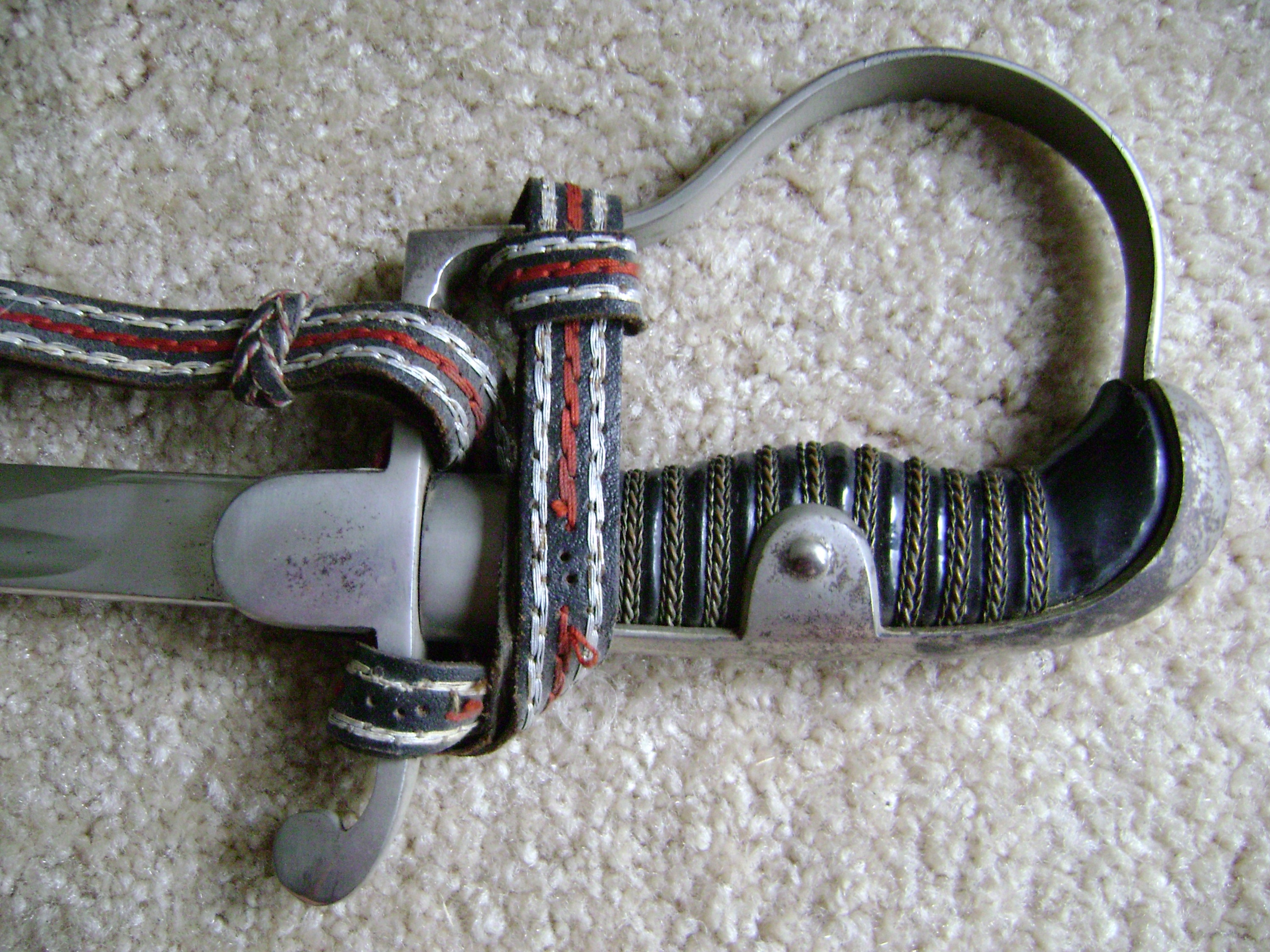 #27 SS Horse mounted model, nickel /chrome plate w/ original black painted scabbard. Too long to wear afoot. Proper troddel. No SS markings. See p.69 “Edged Weaponry of the Third Reich” by MAJ. John Angolia. He states “This specimen" has the SS-Sigrunen..Mfg. ALCOSO The shorter version is the early Fire Official sword and these two are often confused $500.00