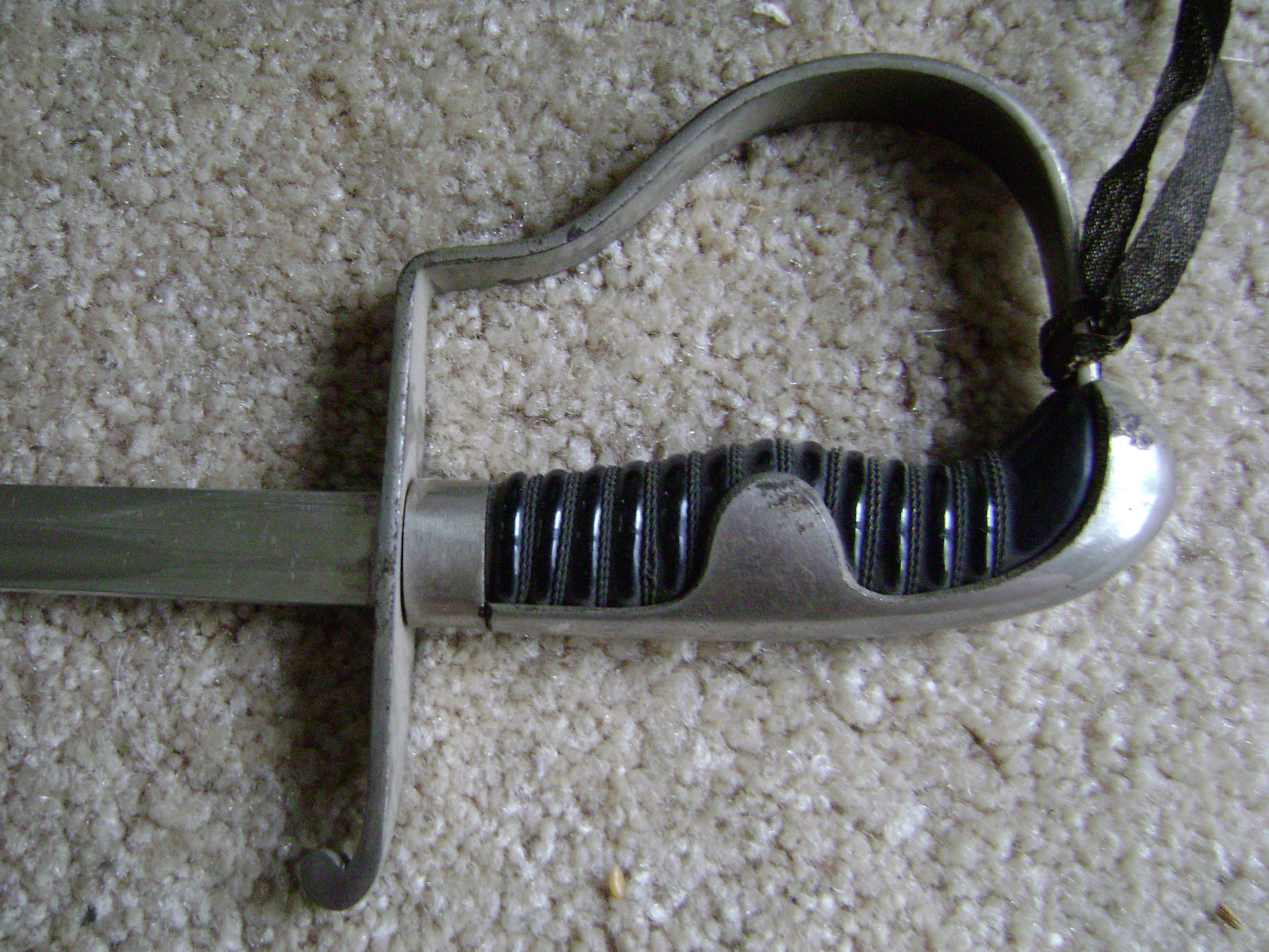 #39 Young Boy Page in the Reich Chancellery. Nickel plate fittings, black celluloid grip with wire wrap, no langlet, black painted steel scabbard, 31.5 inches long. Mfg. Unmarked $250