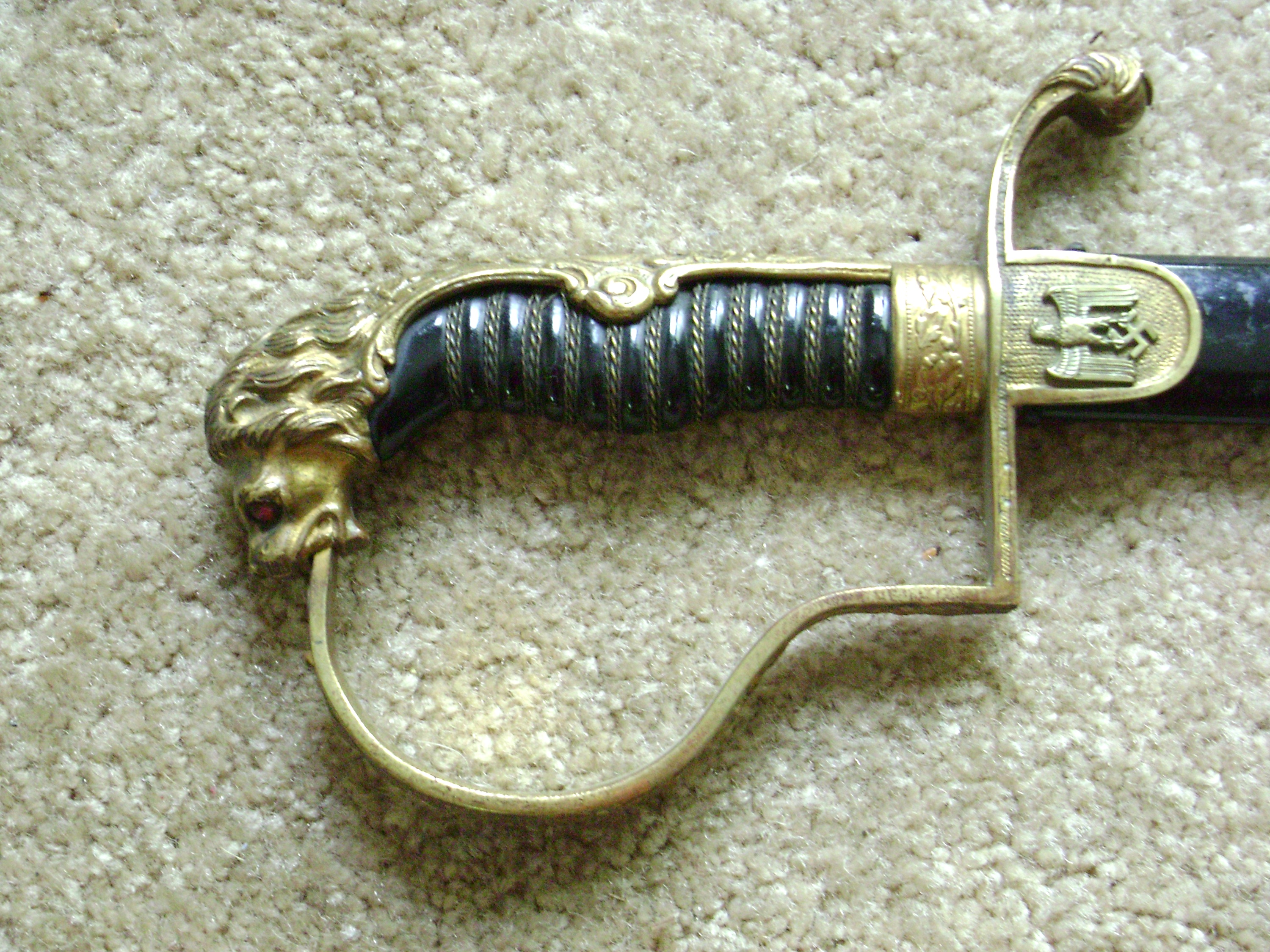 #44 Army Lion Head, gold wash over brass, scarce and expensive gold eagle affixed to langlet. Original steel scabbard. Mfg. WKC. I’ve never seen a photo of this example but I read a reference long ago that stated it was …”rumored to exist.” Original WKC catalog p.175. states "If desired the purchaser could order this model with a gold rather than the silver plated eagle. $800.00