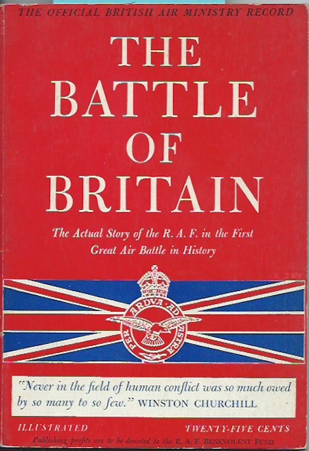 First edition 1941. Size 7-/34 X 5-3/4. "THE ACTUAL STORY OF THE R.A.F. IN THE FIRST GREAT AIR BATTLE IN HISTORY".