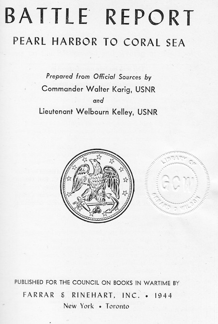 Prepared from official sources by Commander Walter Karig, USNR and Lieutenant Welborne Kelly, USNR. Pub by FARRAR & RINEHART, INC. 1944 NEW YORK-TORONTO. Overall excellent condition.Has previous owners seal impressed into title page. 326 pages of text, extensive casualty list and 7 page index and over 50 black & white period photos. Binding tight, all pages free of notes or scribbling.