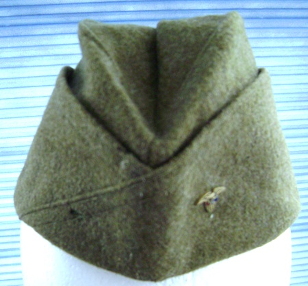 This fine cap has two (2) moth holes that I can find. One on the left side crown, the other on the right side front. NO tags, owner marks. The pin is a screw back eagle & Shield with red-white-blue stones.