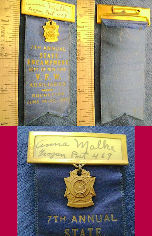 "Anna Malke Troyen Post 469" Maker mark on medal: BASTIAN BROS CO ROCHESTER N.Y. Ribbon is embossed with gold letters: 7TH STATE ENCAMPMENT DEPT. OF NEW YORK V.F.Y. AUXILIARIES ROCHESTER JUNE 24-27 1931. One in stock.