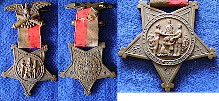 Description: Grand Army of the Republic. PAT. May 4 1886-June 22 1886. Ribbon hand sewn to brooch. No maker mark that I can see.