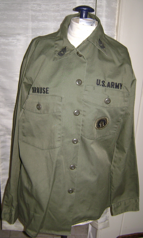 Description: circa 195 or so.U.S. Army and name tape are direct embroider as are First Sergeant collar rank. The 1st Logistics Command patch on the pocket is a regulation patch.