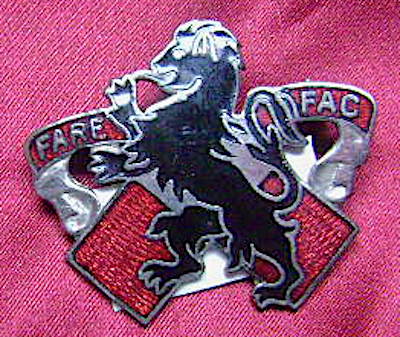 "FARE FAC" Minimal wear for age. Quality enameled. No maker mark. Jeweler type pin back roller catch. One in stock.