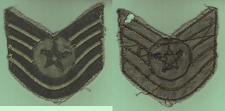 This is a single chevron made in country pictured front and back. It is machine stitched freehand green thread over black velvet onto OD material.